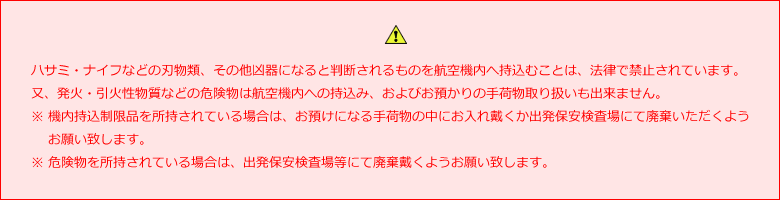 また刃物類など「凶器」として使用される恐れがあるものは機内へのお持ち込みができません。手荷物のご準備の前にご確認ください。