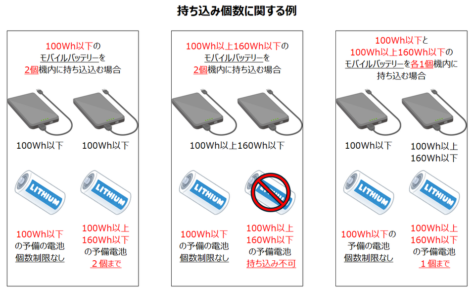 - 機内に持ち込み可能なモバイルバッテリーは、1名当たり2個まで(160Wh以下に限る※)