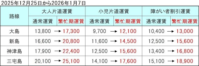 下記の通り2025年12月25日から2026年1月7日の期間において、一部運賃(大人片道/小児片道/障がい者割引)